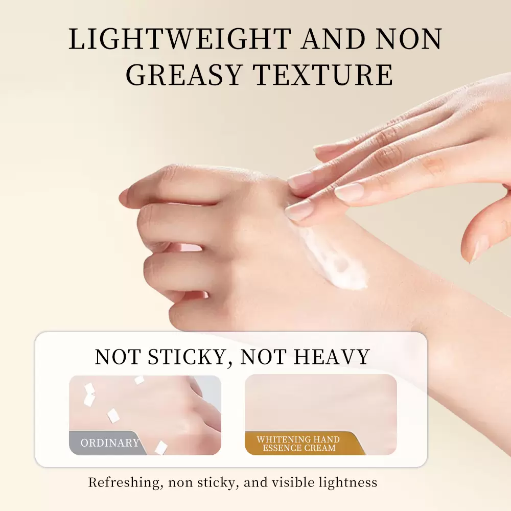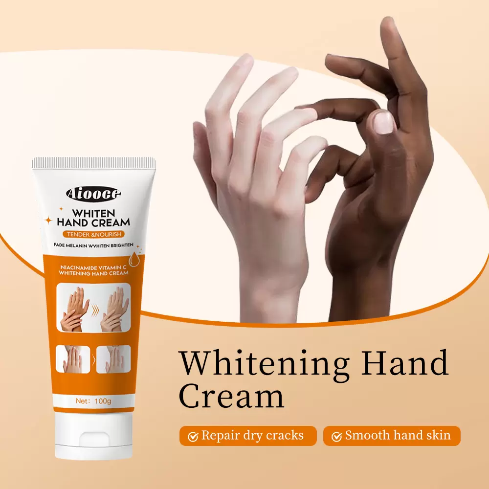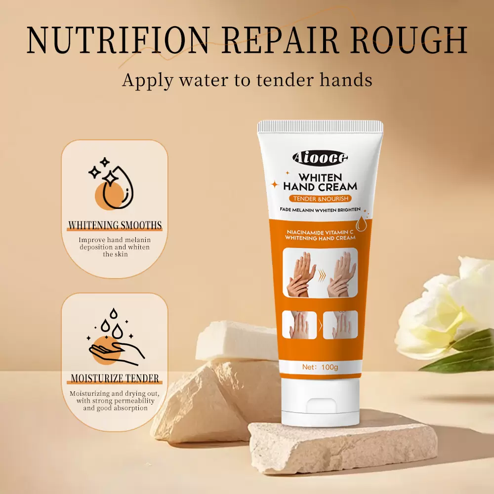 Introducing Aiooce Brightening Hand Cream, your daily solution for soft, radiant hands. This advanced formula is enriched with Vitamin C and natural moisturizers to gently nourish the skin while helping to reduce the appearance of dark spots and uneven tone. It absorbs quickly without a greasy feel, providing long-lasting hydration and leaving hands noticeably smoother and brighter with a fresh, light scent. Perfect for daily use, it protects and revitalizes your hands, revealing a more even, luminous complexion