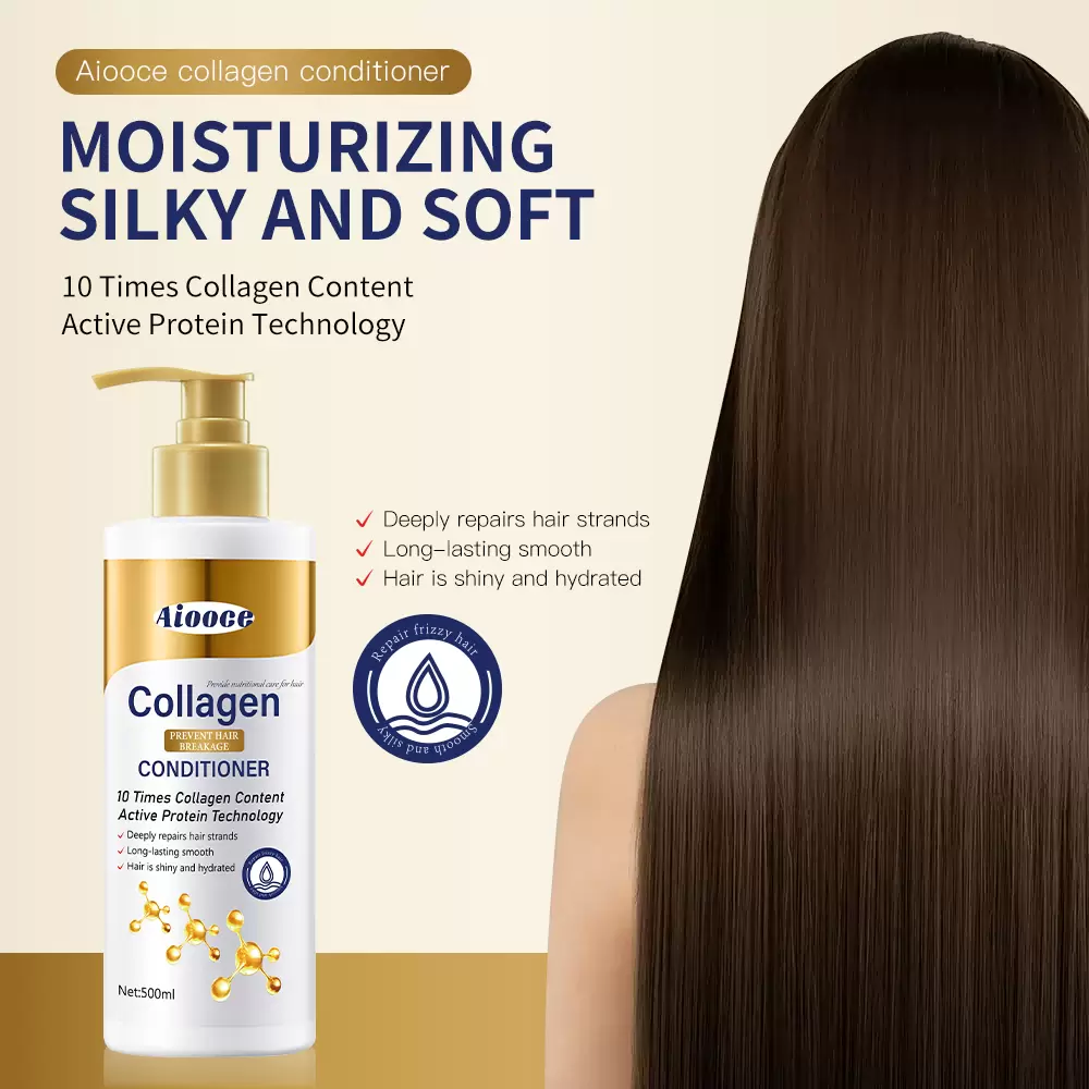 Introducing Aiooce Collagen Protein Conditioner, your solution for damaged, dry hair. Infused with hydrolyzed collagen protein, our formula penetrates deep into the hair shaft to rebuild strength from within and lock in essential moisture. It effectively smooths the cuticle, detangles effortlessly, and seals split ends. With regular use, experience dramatically reduced breakage, enhanced elasticity, and a visibly smoother, silkier mane with a luminous, healthy shine. Transform your hair to feel stronger, softer, and more resilient.