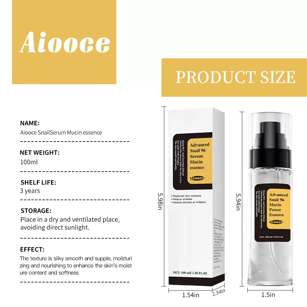 Discover the rejuvenating power of Aiooce Snail Mucin Essence. This lightweight serum is infused with pure snail secretion filtrate, rich in glycoproteins, hyaluronic acid, and glycolic acid. It deeply hydrates, soothes irritation, and promotes skin repair, helping to improve elasticity, fade fine lines, and brighten the complexion. Perfect for all skin types, especially dry or sensitive skin, it absorbs quickly without a sticky feel, leaving your skin smooth, plump, and radiantly healthy with daily use.