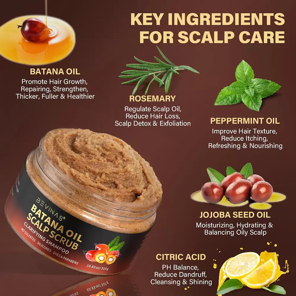 Almond Scalp Scrub: Gently exfoliates to remove flakes and buildup for a balanced, healthy scalp.