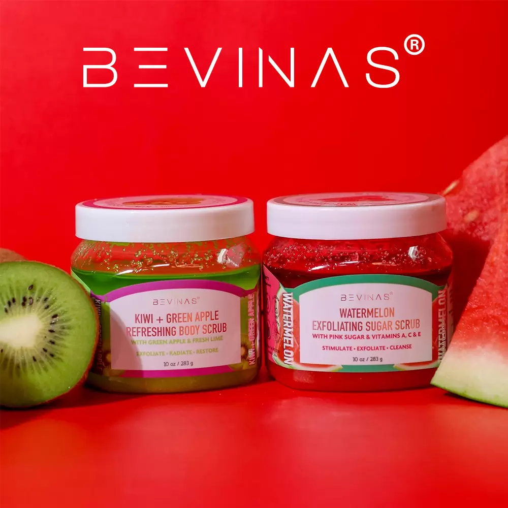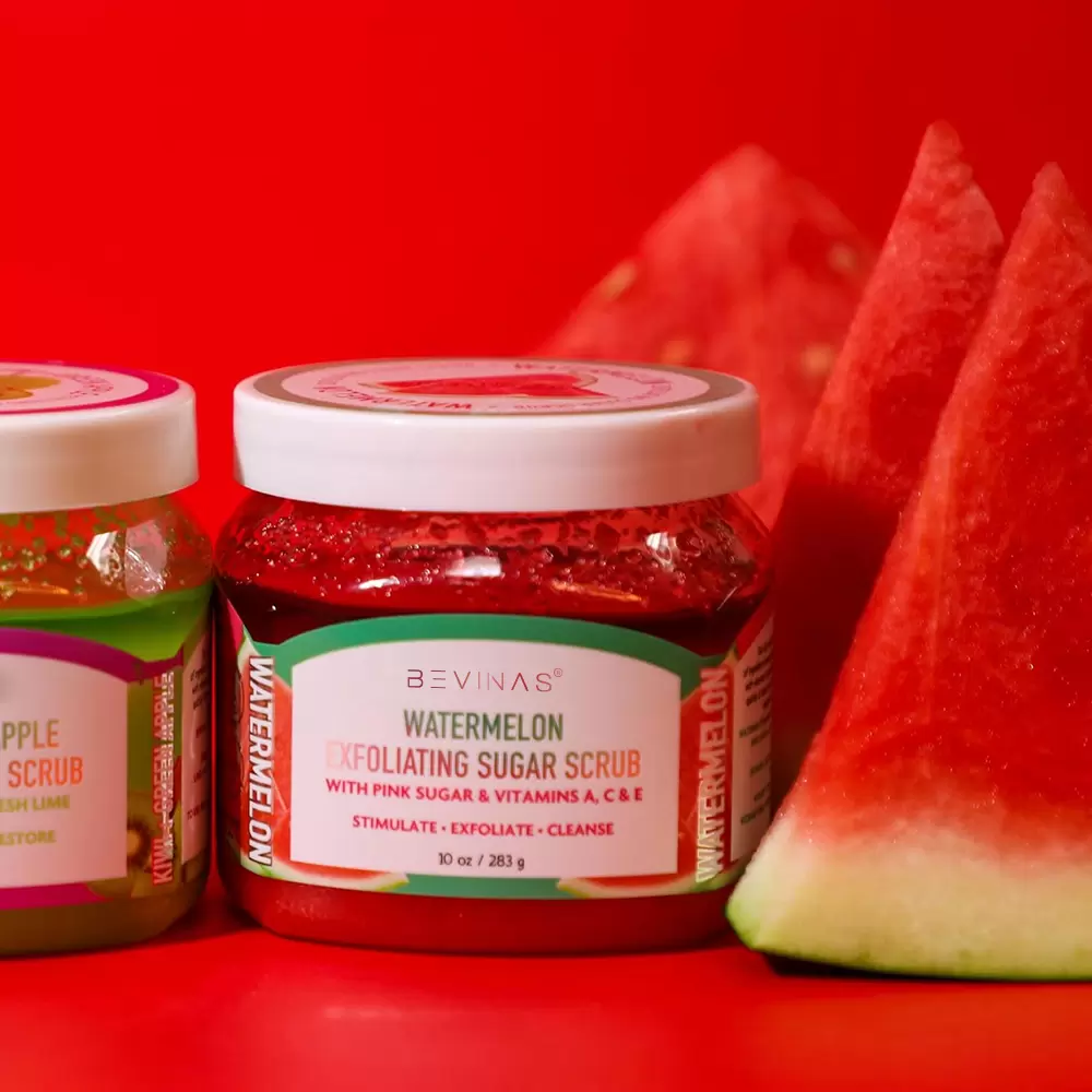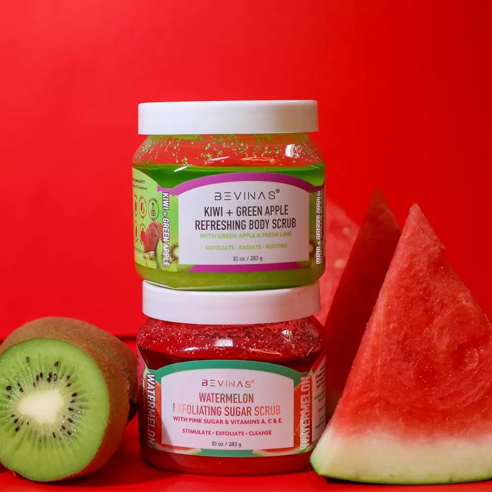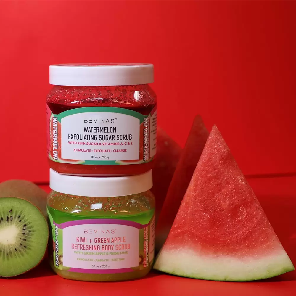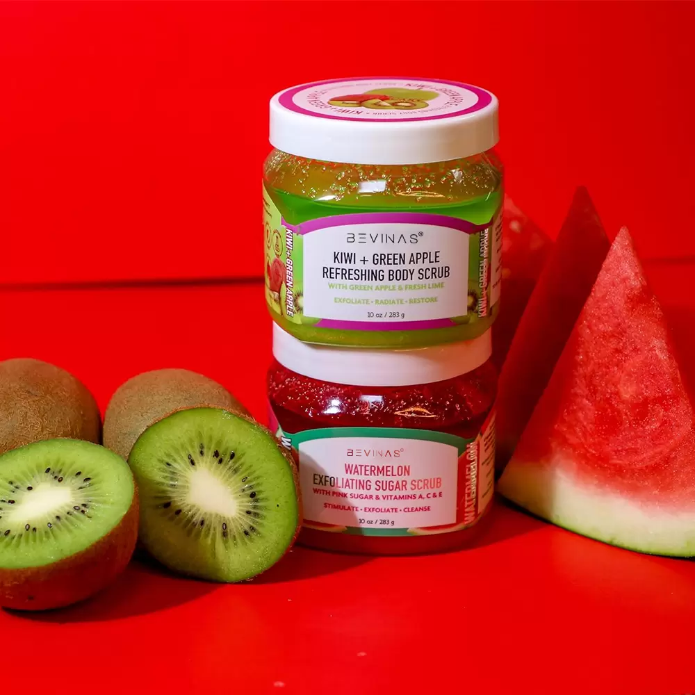 Invigorating Kiwi & Watermelon Body Scrub: Gently exfoliate and hydrate for silky, radiant skin.