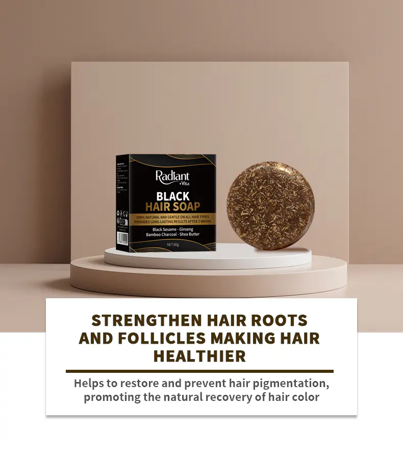 Radiant Vita Hair Color Restoring Bar is your all-natural solution to premature greying. Formulated with potent Black Sesame and Amla extracts, it penetrates deep into the hair shaft to restore natural melanin. Unlike chemical dyes that damage hair, our pH-balanced bar soothes the scalp, reduces hair fall, and fights dandruff. With consistent use, grey roots are gradually minimized, revealing rich, dark tones. It is 100% vegan and cruelty-free. Ditch liquid shampoos for this long-lasting bar that defines silky, vibrant, and naturally dark hair.