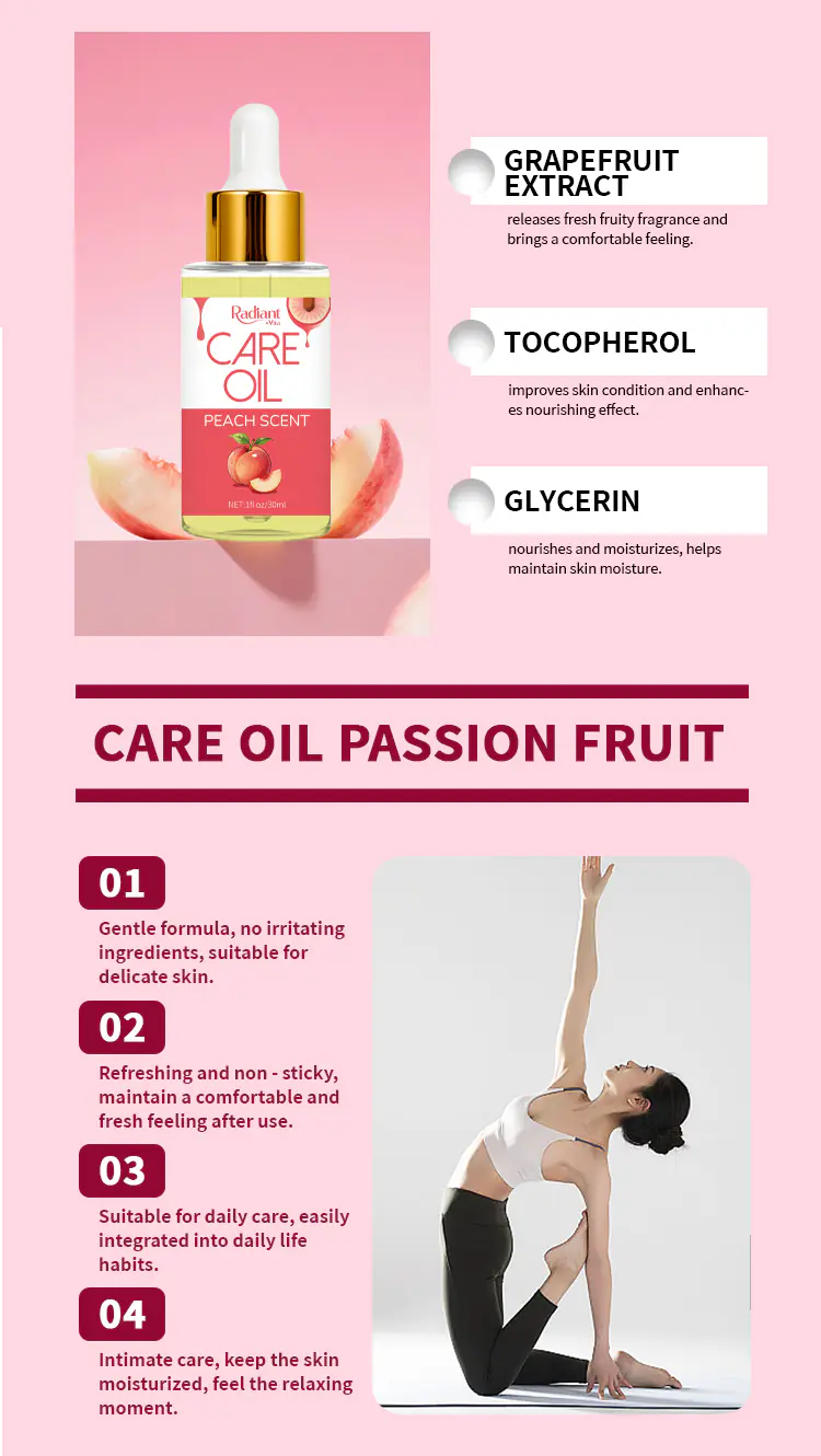 Radiant Vita Feminine Care Oil is expertly crafted for daily intimate wellness. The non-irritating formula helps maintain natural pH balance, effectively relieving dryness and discomfort. Enriched with plant-based extracts, it provides a protective barrier against bacteria while soothing sensitive skin. Designed for modern women, it offers long-lasting moisture and a fresh sensation without harsh chemicals, making it an essential part of your self-care routine for lasting confidence and comfort.
