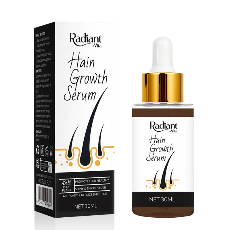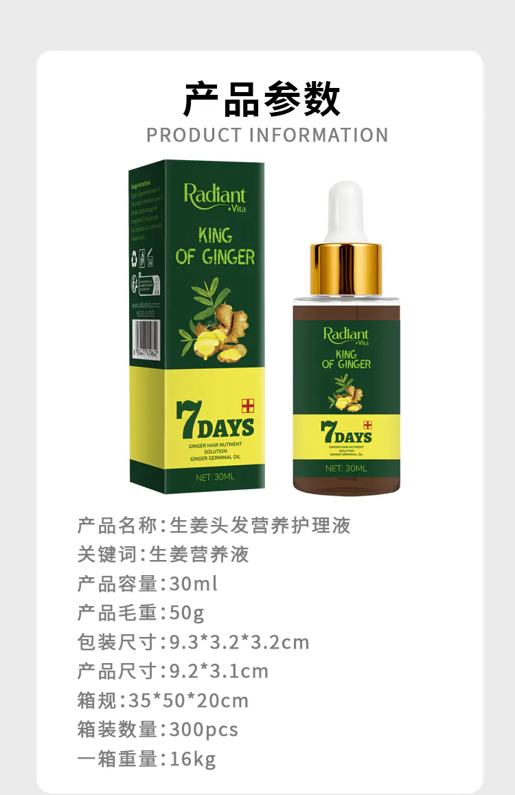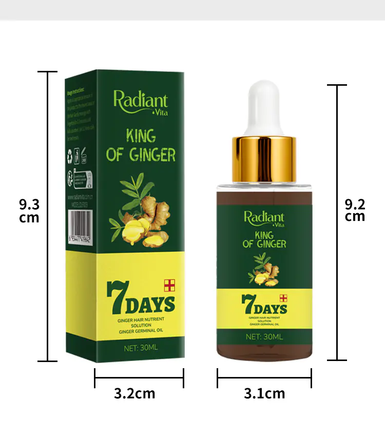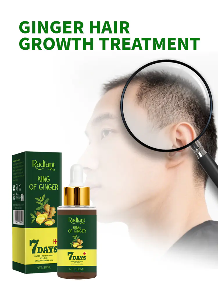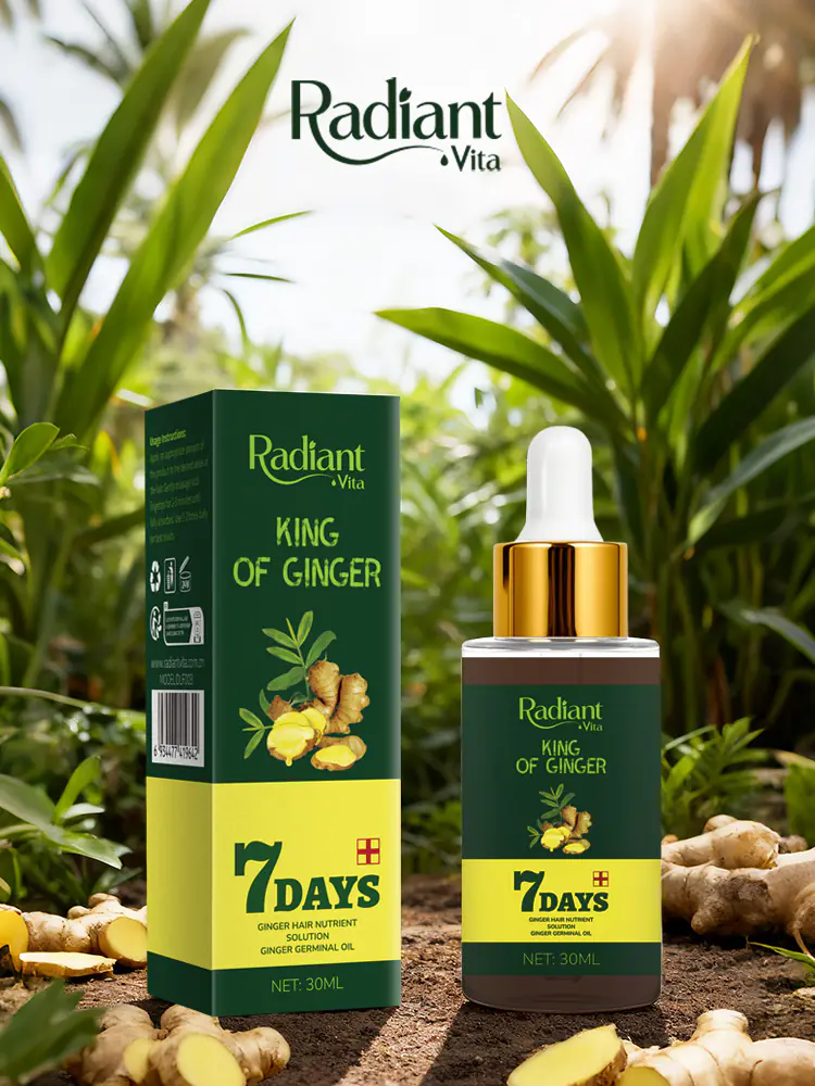 Radiant Vita Ginger Nutrient Solution is a concentrated formula that harnesses the natural power of ginger to awaken the scalp and fortify hair follicles. This revitalizing treatment helps improve local microcirculation, delivering essential nutrients directly to the hair roots. By reducing scalp stress and promoting a balanced environment, it effectively minimizes hair thinning caused by nutrient deficiencies. Ideal for daily care, the lightweight, non-greasy texture absorbs quickly without leaving residue. Suitable for all hair types, it strengthens strands, boosts natural shine, and restores vitality to dull, tired-looking hair. Consistent use helps maintain a healthier foundation for thicker, fuller hair growth.