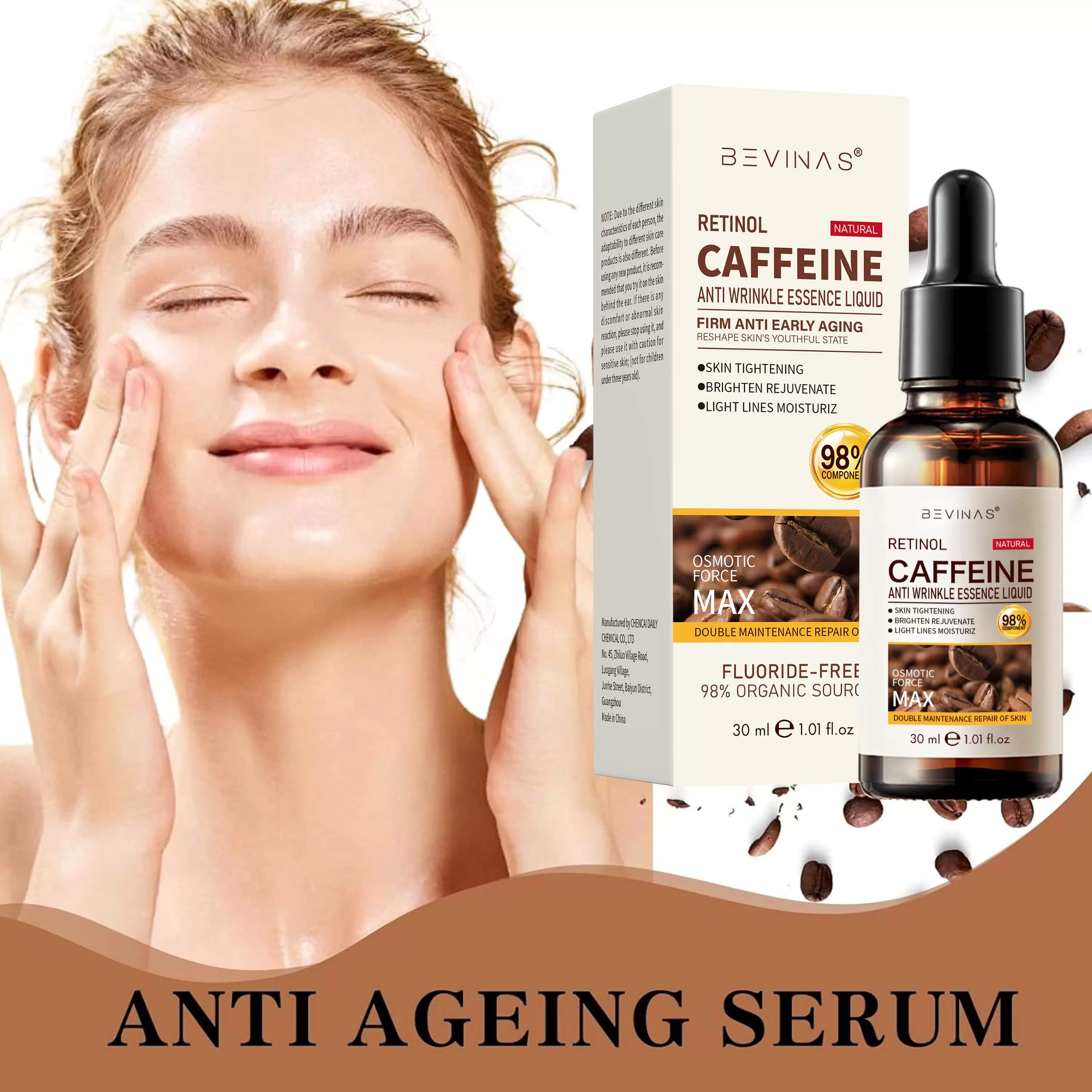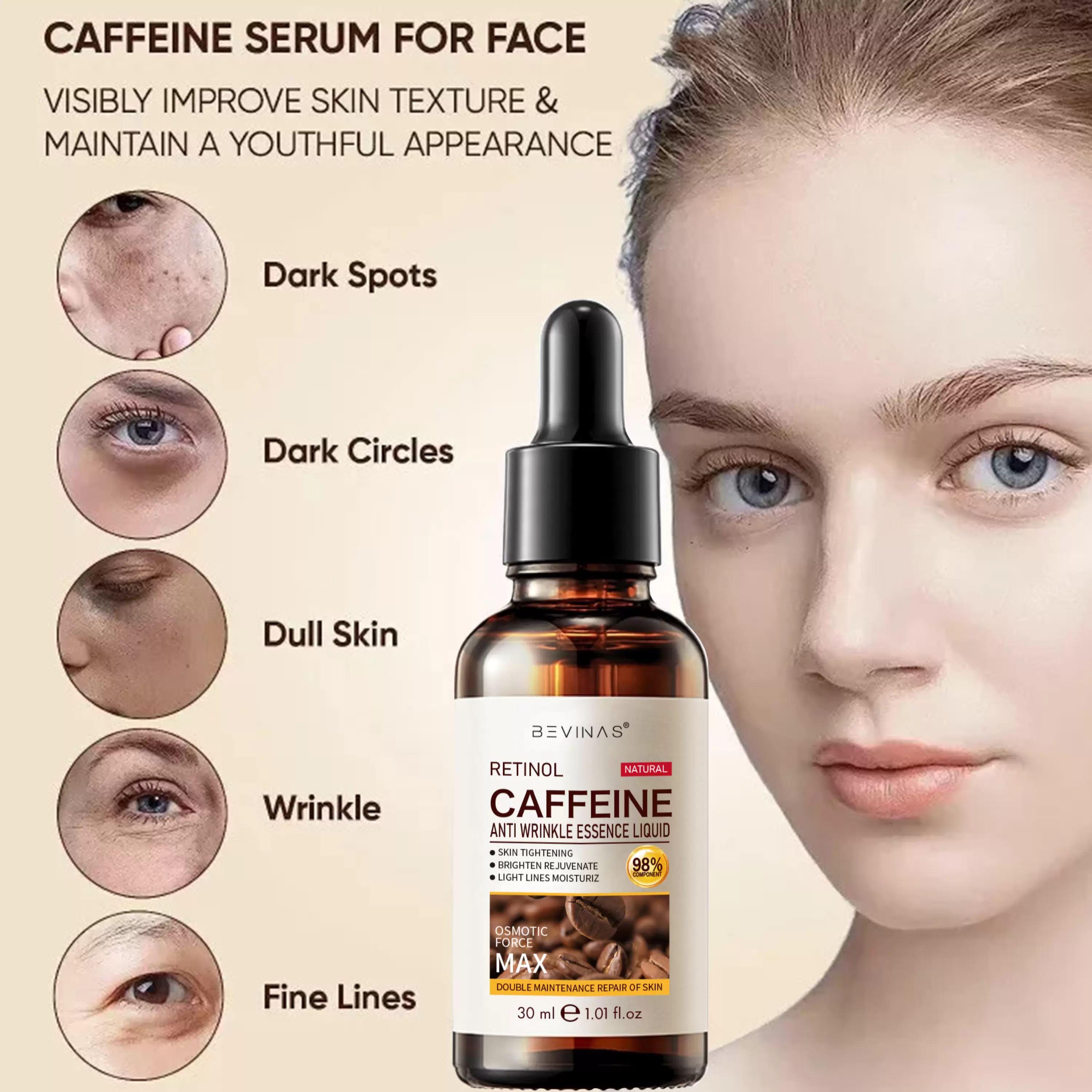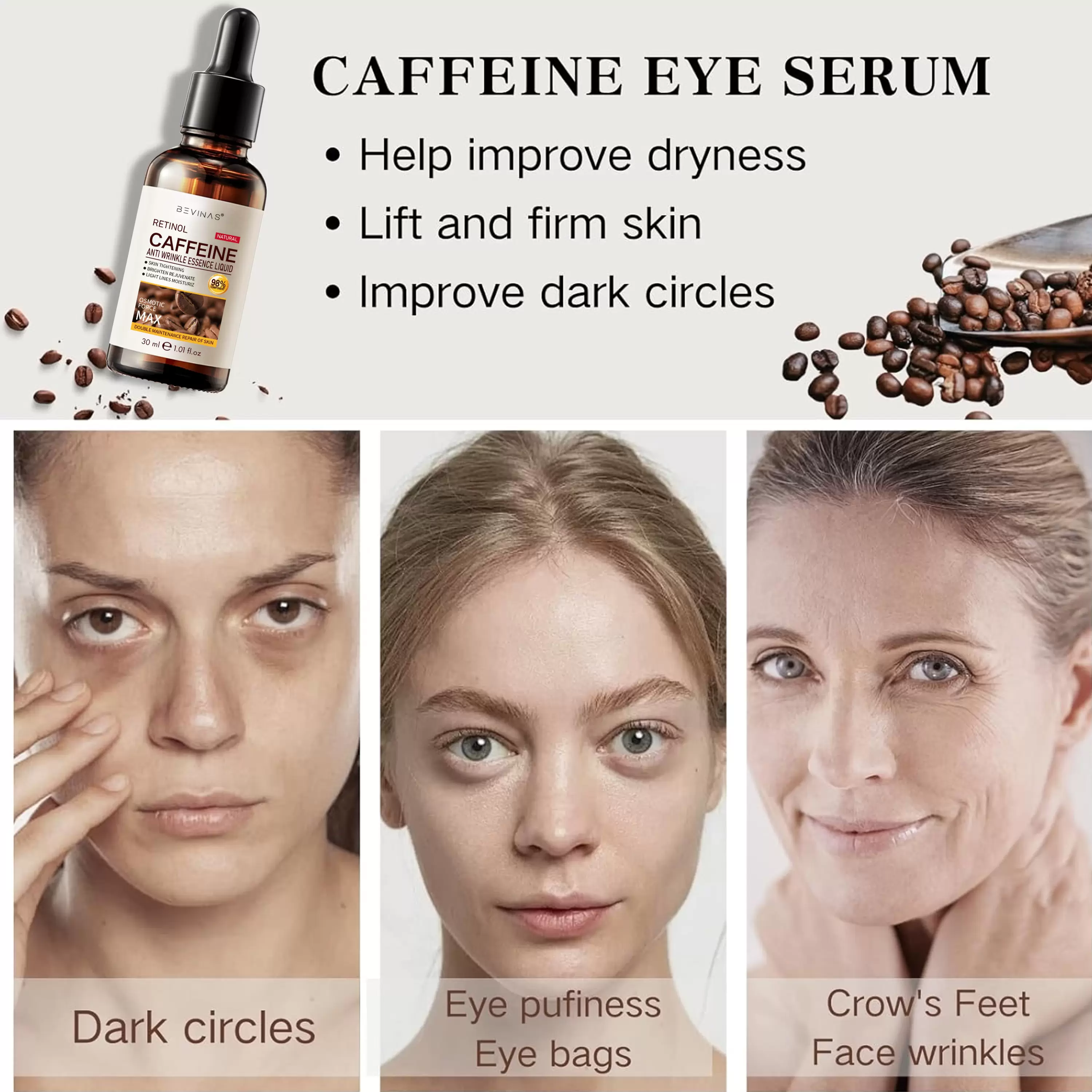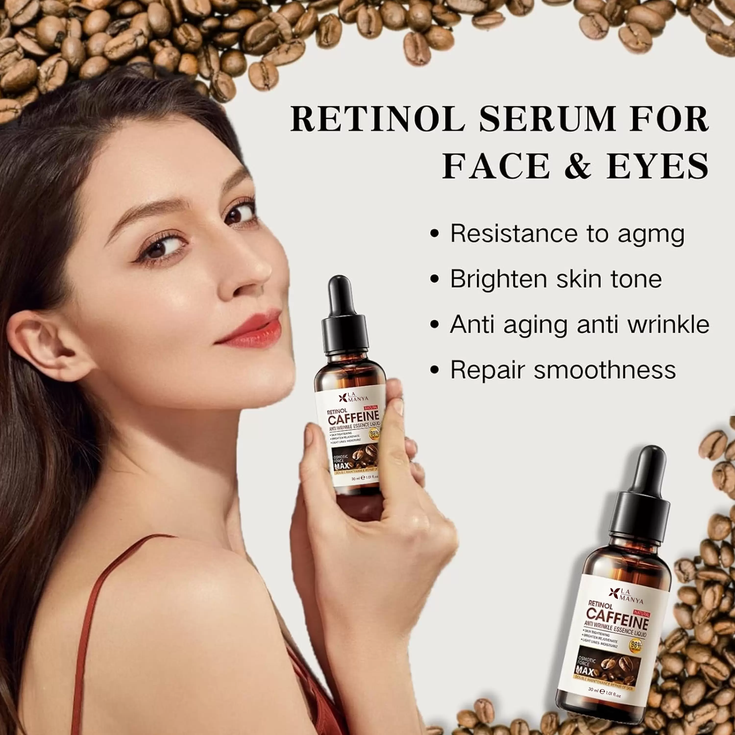 Revive & Define: A potent anti-aging serum with Retinol and Caffeine to smooth wrinkles and firm skin.